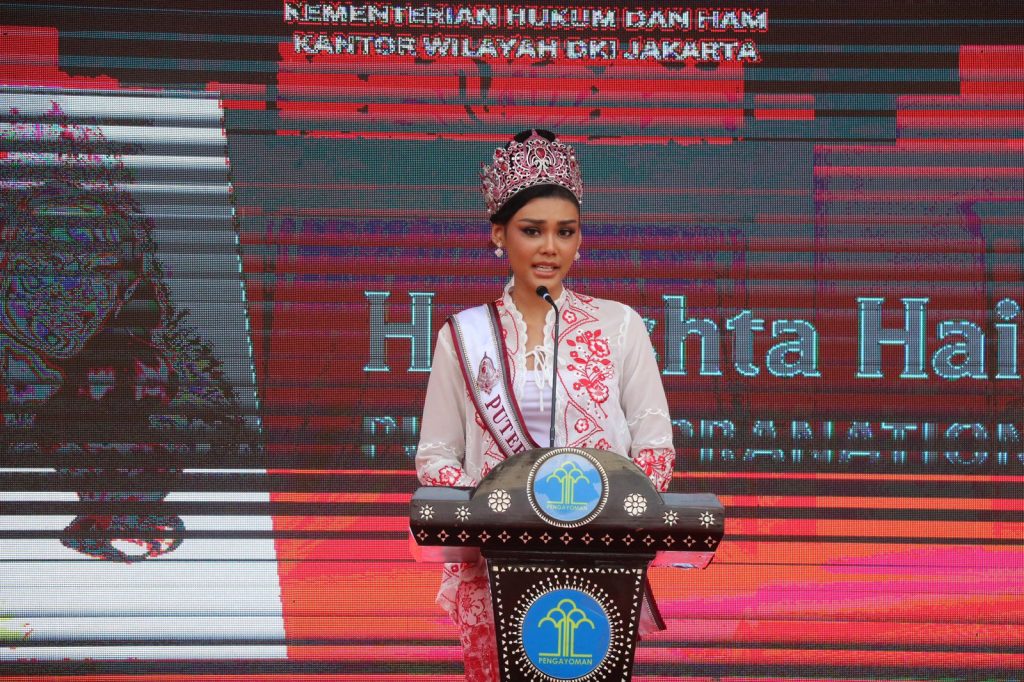Tak tanggung-tanggung, Kanwil Kemenkumham DKI Jakarta menggandeng puteri Indonesia tahun 2024 Harashta Haifa Zahra yang membacakan pernyataan komitmen sadar kekayaan intelektual. Juga, mempromosikan dan melestarikan budaya Betawi.