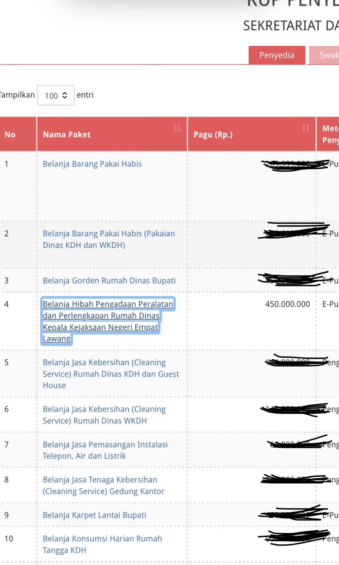 Empat Lawang – Pemerintah Kabupaten Empat Lawang kembali menjadi sorotan terkait belanja hibah pada tahun anggaran 2026. Berdasarkan data yang dilansir dari Sistem Informasi Rencana Umum Pengadaan (SiRUP), terdapat pengadaan perlengkapan rumah dinas untuk Kejaksaan Negeri (Kejari) Empat Lawang yang nilainya mencapai Rp450 juta.